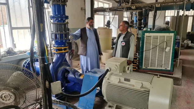 Un personnel du CICR avec un représentant de l’UWASS d’Herat inspectant les pompes d’amplification d’eau récemment installées. PHOTO : CICR/Dawajan RAHIMI