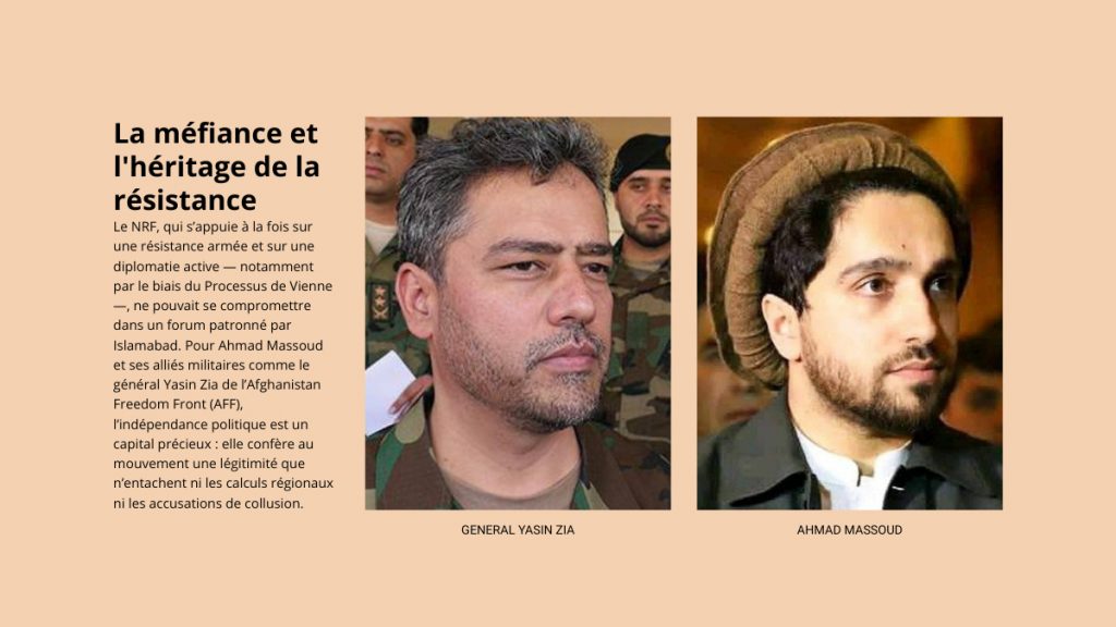 Le NRF, qui s’appuie à la fois sur une résistance armée et sur une diplomatie active — notamment par le biais du Processus de Vienne —, ne peut se compromettre dans un forum patronné par Islamabad. Pour Ahmad Massoud et ses alliés militaires comme le général Yasin Zia de l’Afghanistan Freedom Front (AFF), l’indépendance politique est un capital précieux : elle confère au mouvement une légitimité que n’entachent ni les calculs régionaux ni les accusations de collusion.
