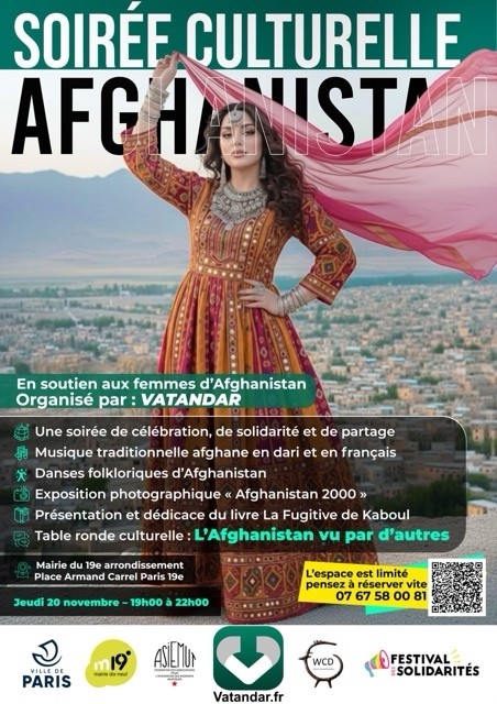 🎉 Soirée culturelle – Afghanistan : une immersion culturelle unique 🇦🇫 Le 20 novembre, notre association Vatandar organise une soirée spéciale dédiée aux femmes afghanes – un moment d’échanges, de musique, de poésie et de solidarité. Cette soirée vise à mettre en lumière la richesse de la culture afghane et le courage des femmes qui la portent.