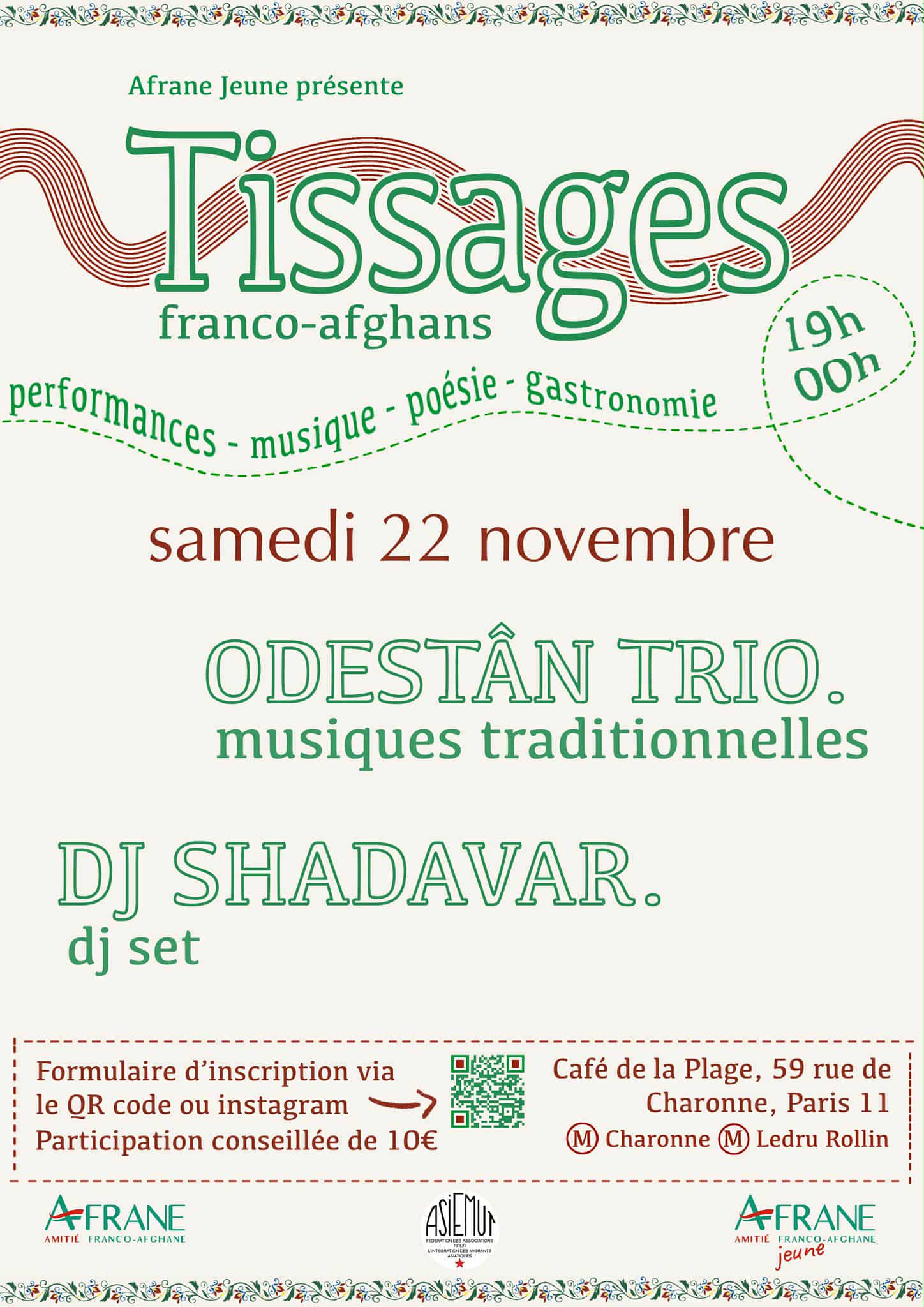 Nous vous proposons de déguster des spécialités afghanes, de rencontrer des artistes afghans qui parleront de leur expérience en France, d’écouter le trio Odestân qui vous proposera un set de musiques traditionnelles afghanes, avec Jawad Ghani au chant et à l’harmonium, Nadjib Ghani au tabla et Corentin Restif à l’accordéon. La soirée se clôturera sur le set de DJ Shadavar qui nous offrira une vision moderne de ce qu’est aussi l’Afghanistan.